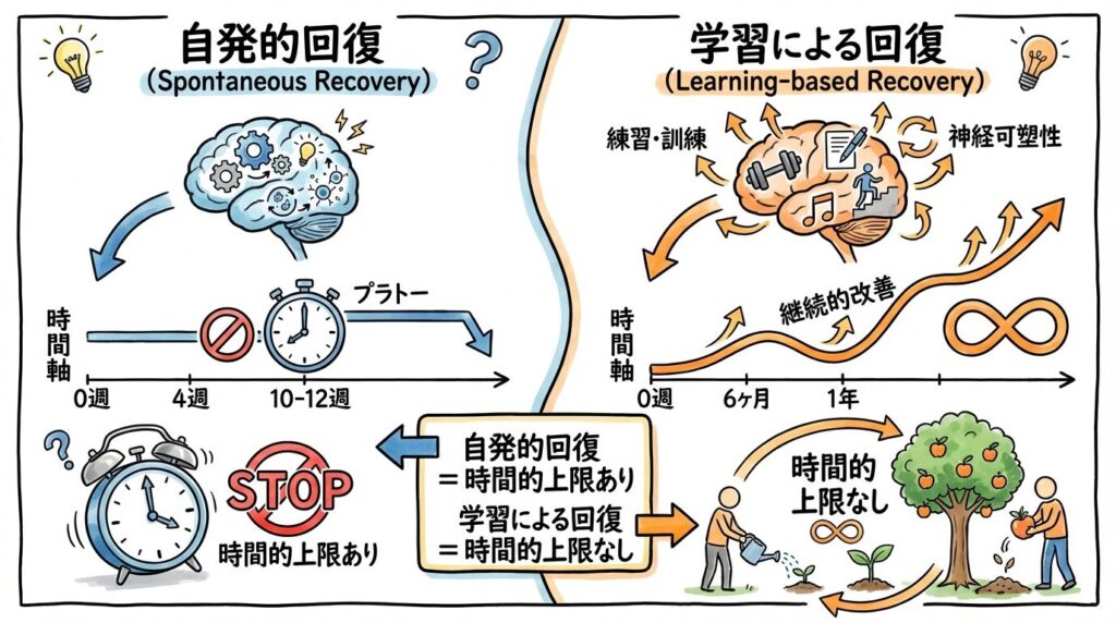 「発症から6ヶ月で回復の窓が閉まる」「1年を過ぎると変化しない」——こうした言葉が一人歩きしている背景には、自発的回復と学習による回復の混同があります。この2つは、起きているプロセスが根本的に異なります。
