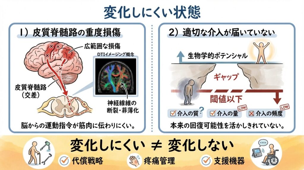 生物学的な可塑性が残存していても、それを引き出す質と量を持った介入が提供されていなければ変化は起きません。「リハビリをやっているが変わらない」という状況の中に、介入の種類・負荷・量・頻度が可塑性を誘導する水準に達していないケースが含まれている可能性があります。これは当事者の問題ではなく、介入設計の問題です。