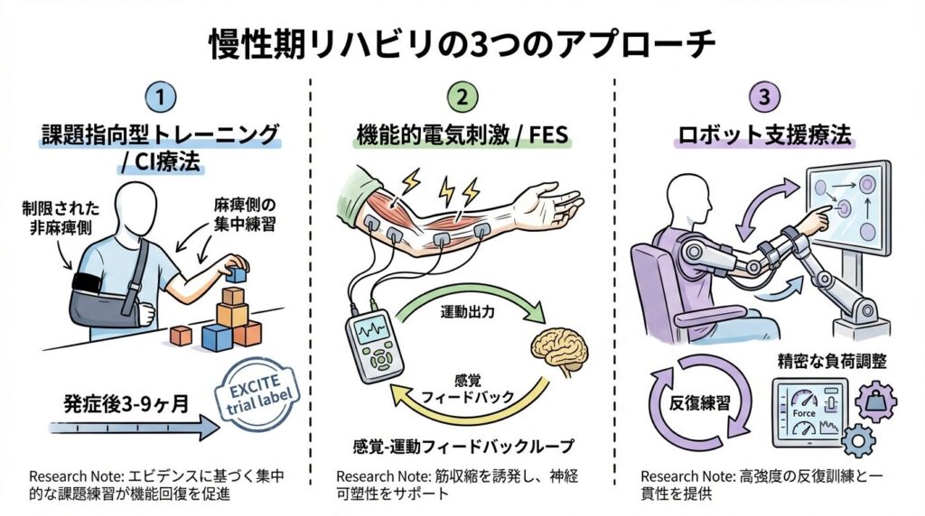 Wolf ら(2006)が実施したEXCITE試験は、発症後3〜9ヶ月の慢性期上肢麻痺患者を対象に、constraint-induced movement therapy(CI療法)の効果を検証したRCTです。CI療法群では非麻痺側上肢の使用を制限しながら麻痺側上肢の集中的な課題練習を行い、対照群と比較して上肢機能の有意な改善が12ヶ月後にも維持されることが示されました。この結果は、発症から時間が経過した慢性期においても、適切な強度・量の介入によって上肢機能に変化が生じうることを示しています。