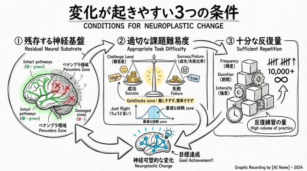 ただし、それは「誰にでも」「いつでも」起きるわけではなく、残存する神経基盤と介入の質・量が条件として関わってきます。