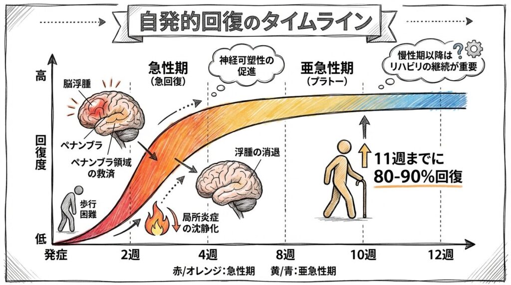 自発的回復(spontaneous neurological recovery)とは、脳梗塞や脳出血後に、浮腫の消退・局所炎症の沈静化・ペナンブラ(梗塞周辺の生存組織)の機能回復などによって、特別な介入がなくても機能が改善に向かうプロセスです。